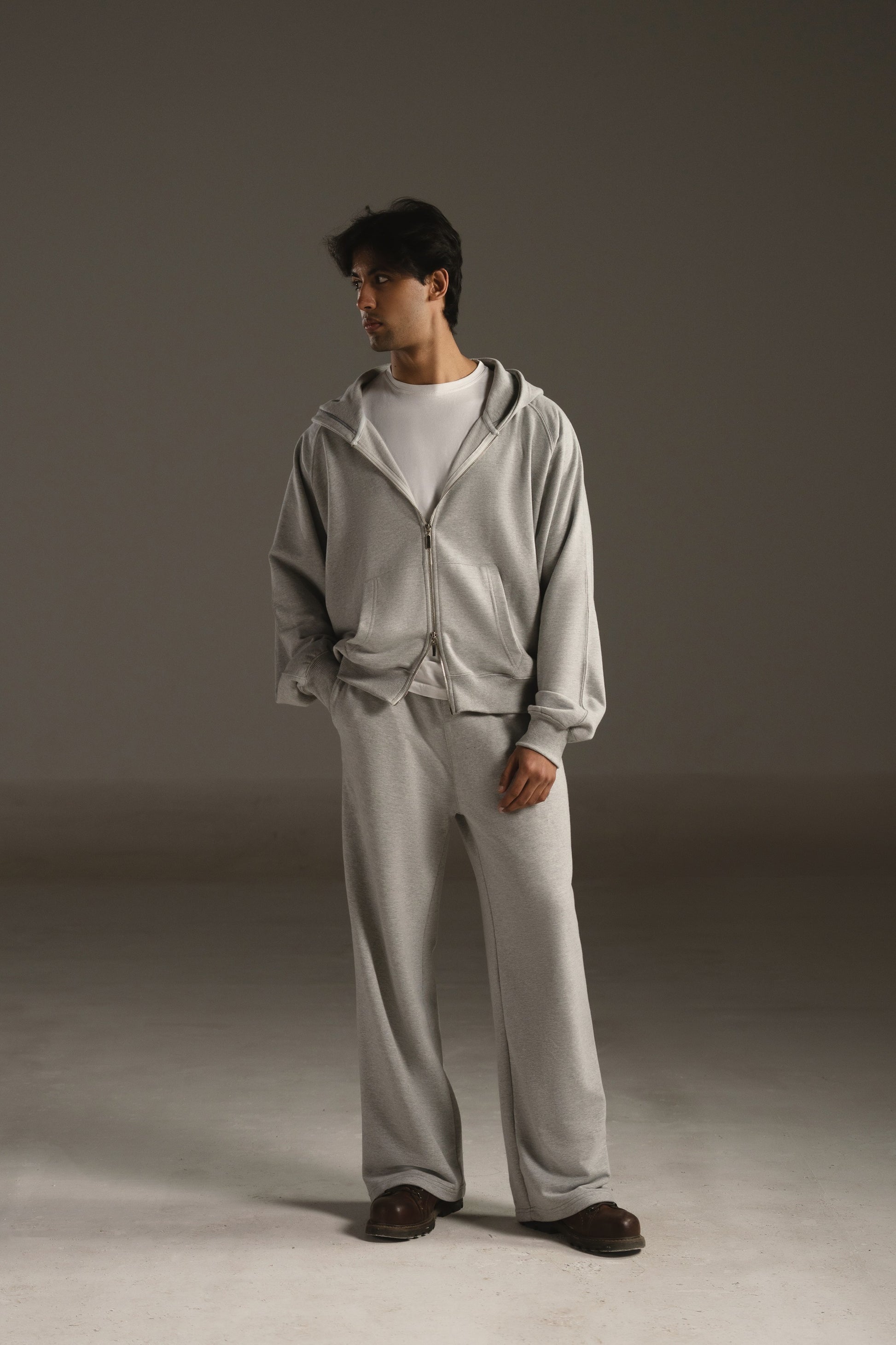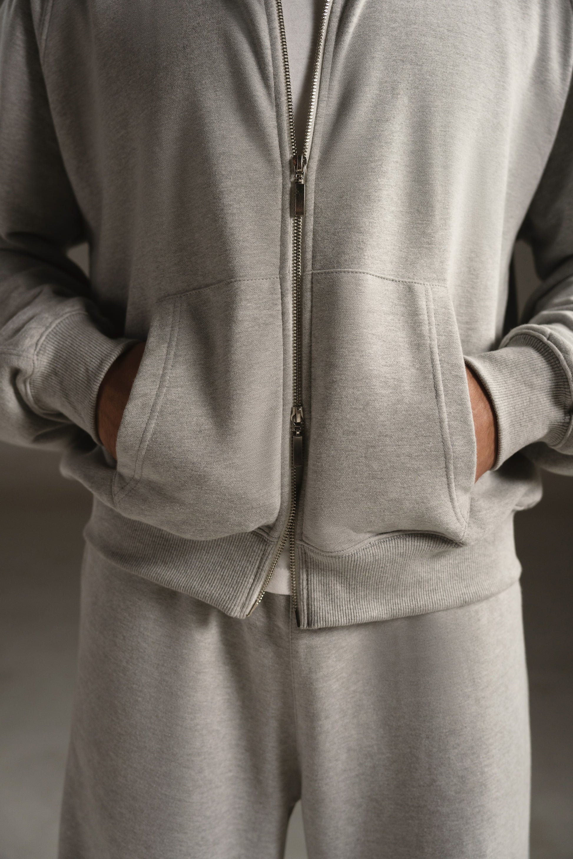 The R3 Zipper — Cloud Grey is constructed from 450 GSM French Terry, chosen for its breathability, fluid drape, and clean surface texture. Where fleece offers density, French terry delivers movement — making the R3 a lighter, more architectural expression of the OUTCAST silhouette.